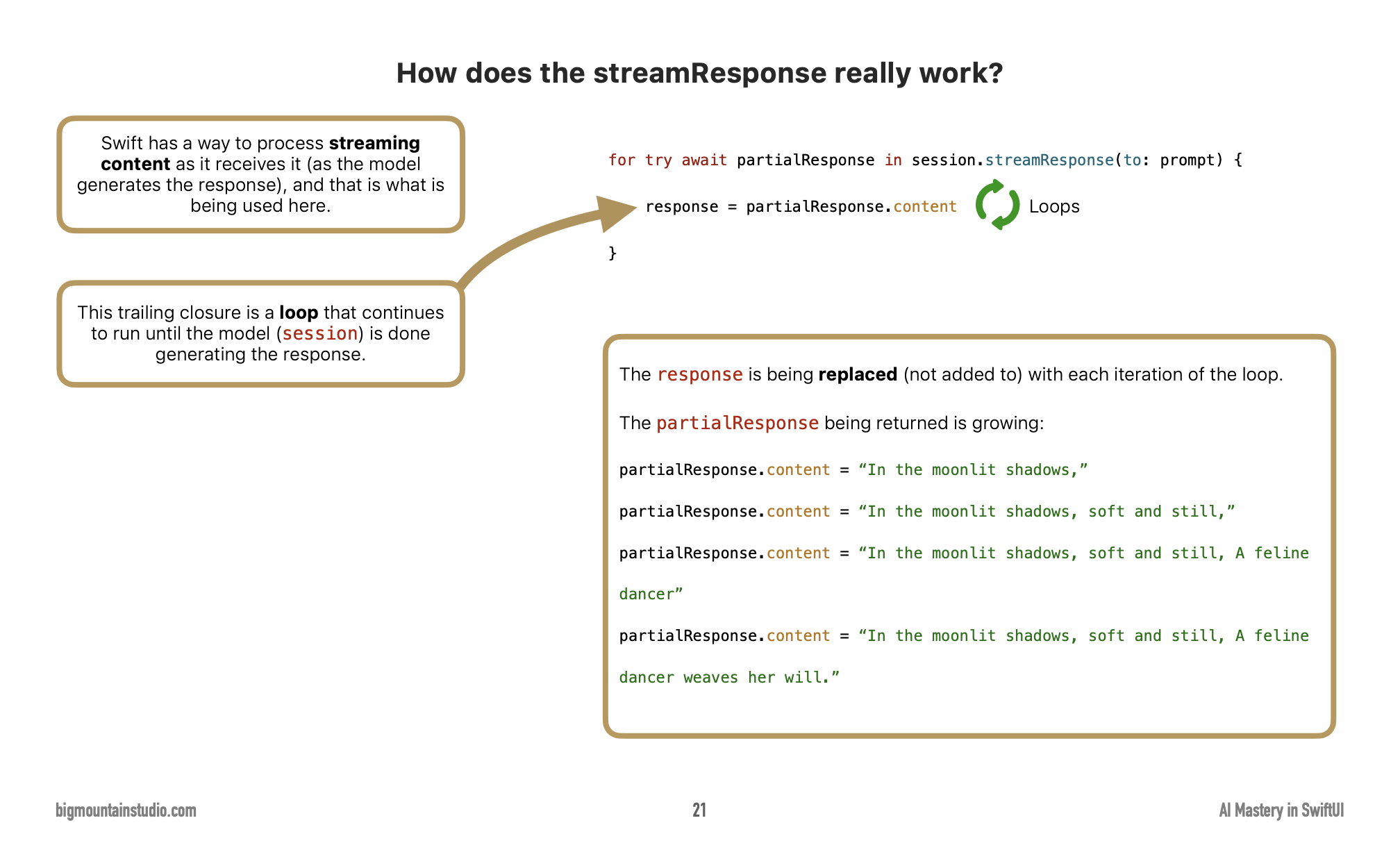 Unfortunately, I started to realize that this doesn't work well because it's almost like rewriting the whole book from the perspective of streaming the response from the model, which includes: