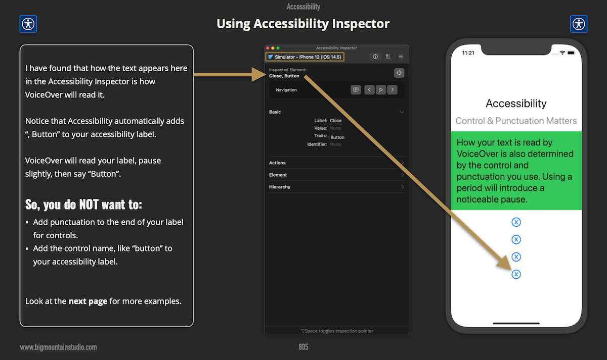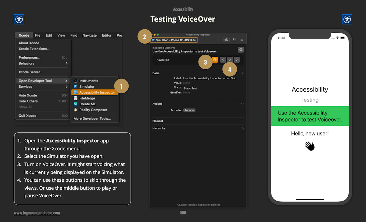 Use the Accessibility Inspector to help you set up voiceover on your screens