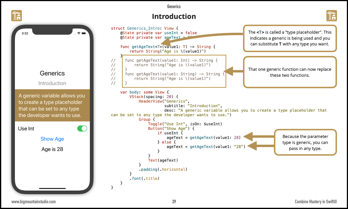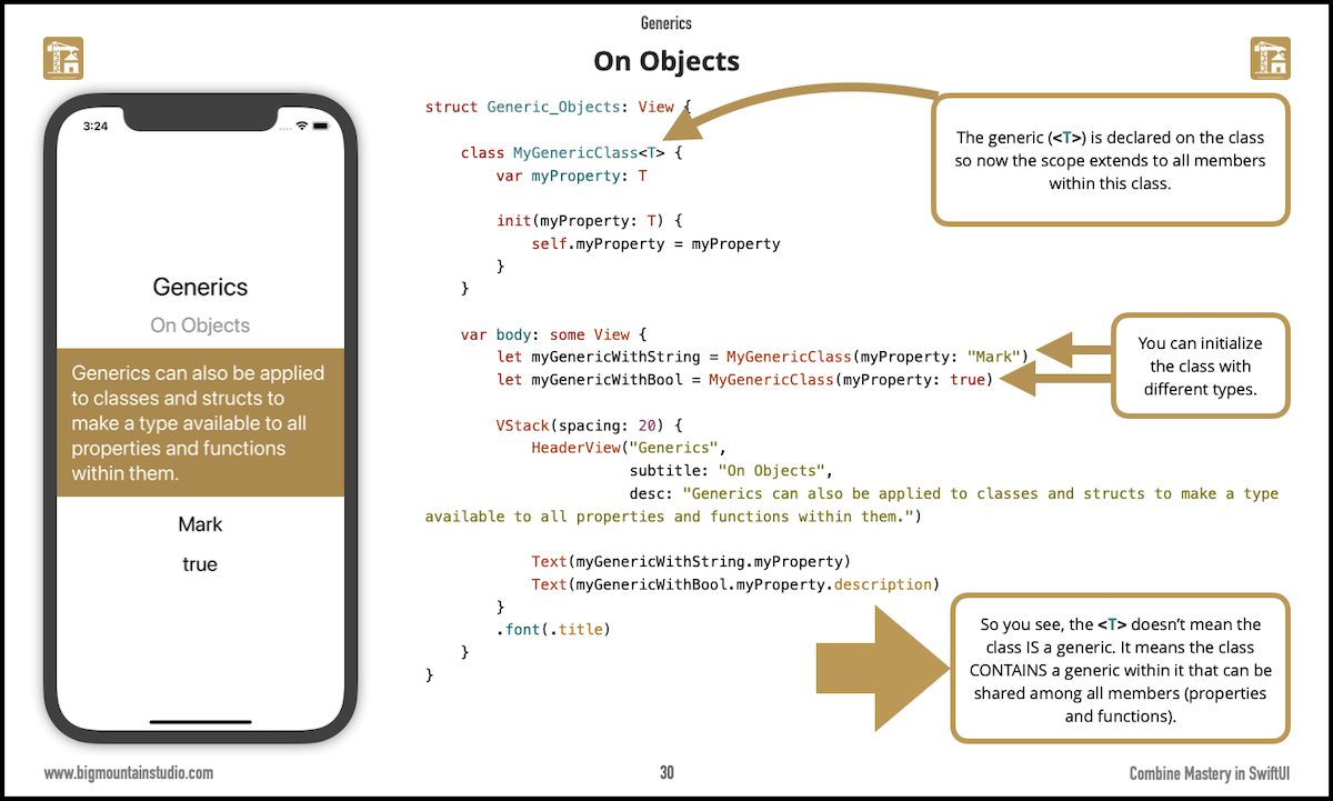 Generics play such a major role in #Combine that even the slightest refresh of knowledge on the topic will greatly boost your understanding of how all the parts of Combine fit together. At the end of this section, Mark will show you how generics relate back to Combine. <your link>