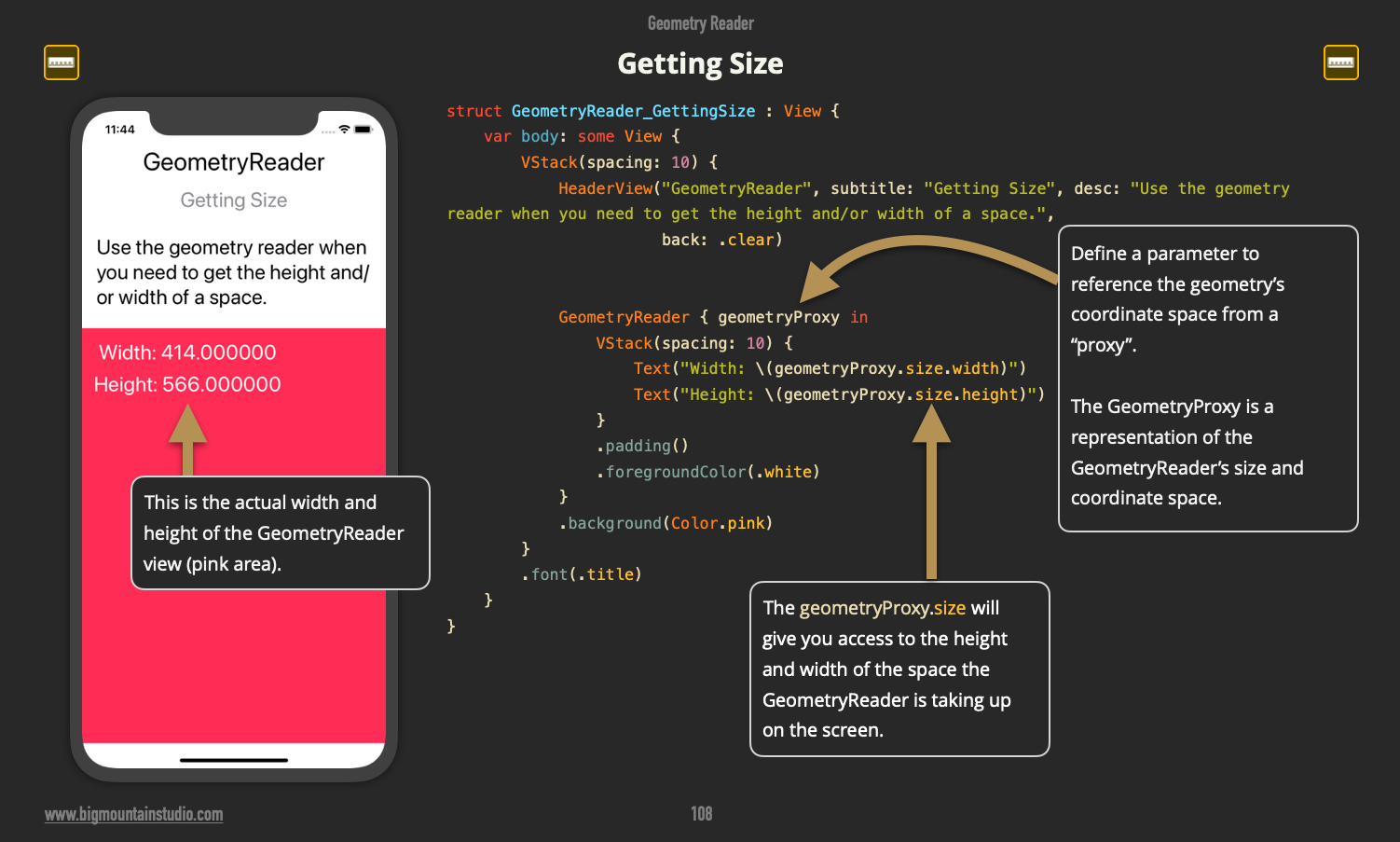 In #SwiftUI, you can't reference views directly and get their height or width. Instead, you can use a GeometryReader to get view height and width info. Need to get coordinate (X,Y) information? Find out how using this book: <your link>