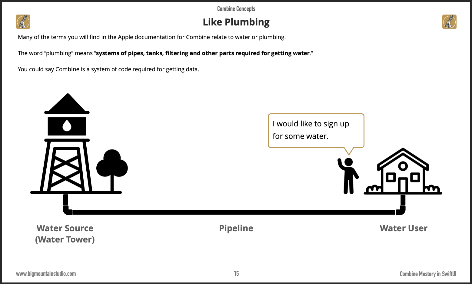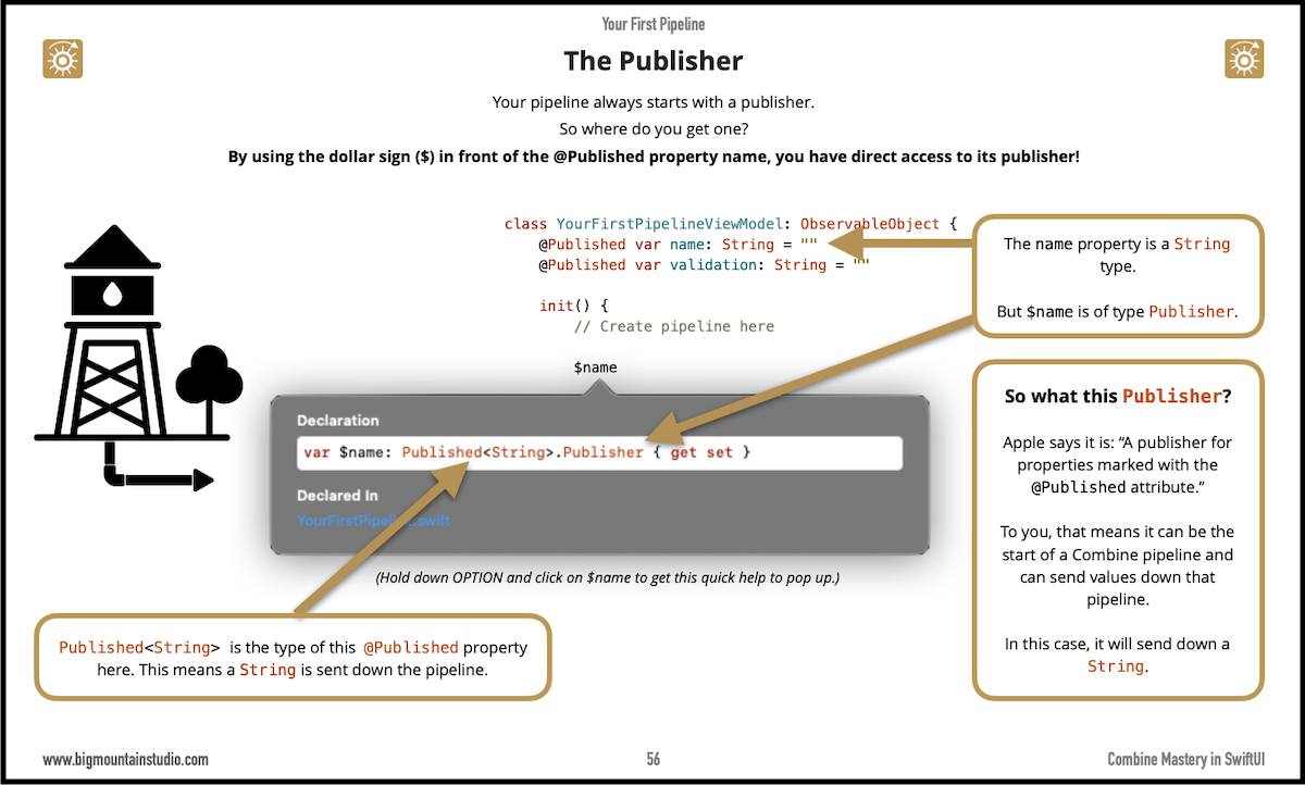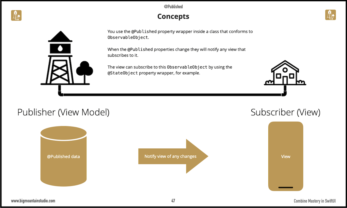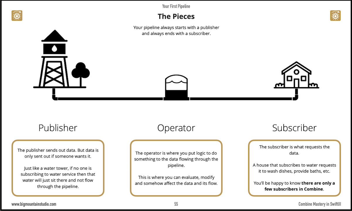 You may not know it but if you're familiar with the Published property wrapper and how it connects to your view then you already have a concept of how #Combine works! The whole idea behind Combine is you create "pipelines" that start with a publisher (the water tower) and end with a subscriber (the house consuming the water).