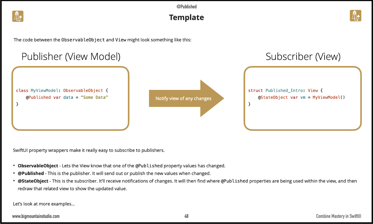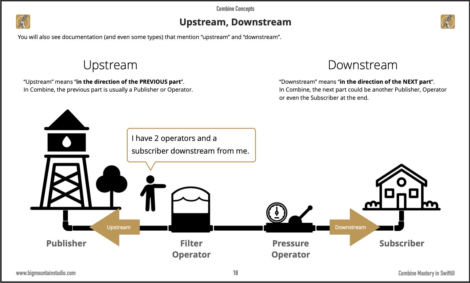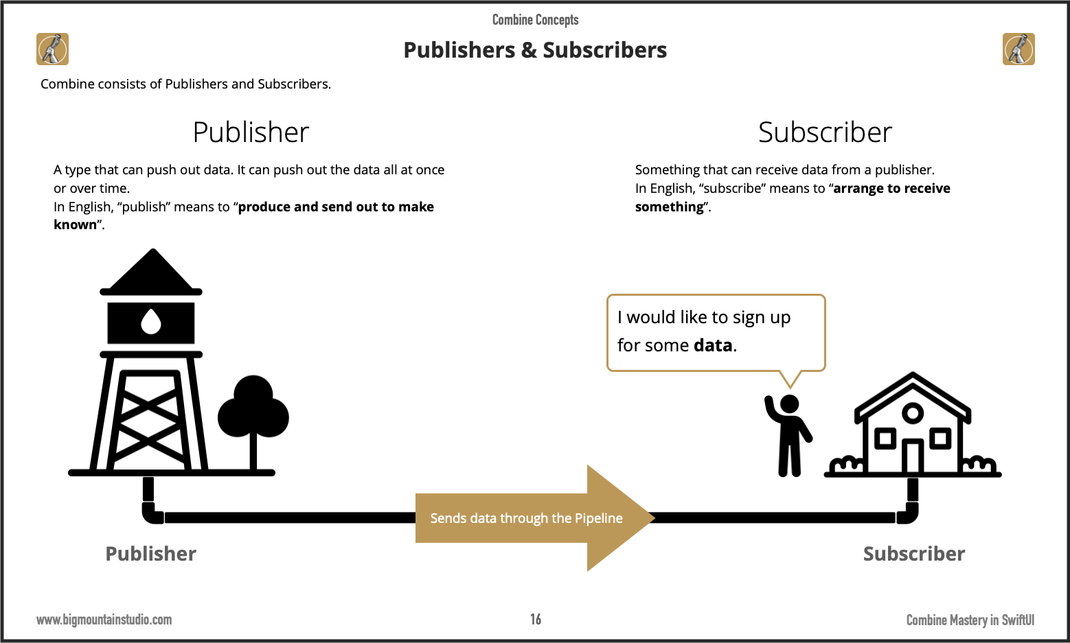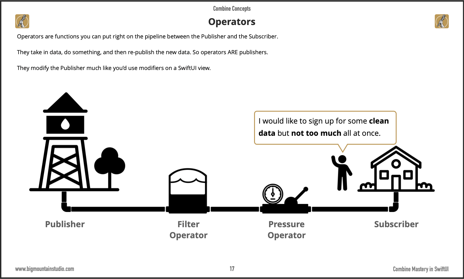 You may not know it but if you're familiar with the Published property wrapper and how it connects to your view then you already have a concept of how #Combine works! The whole idea behind Combine is you create "pipelines" that start with a publisher (the water tower) and end with a subscriber (the house consuming the water).