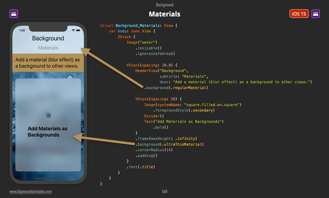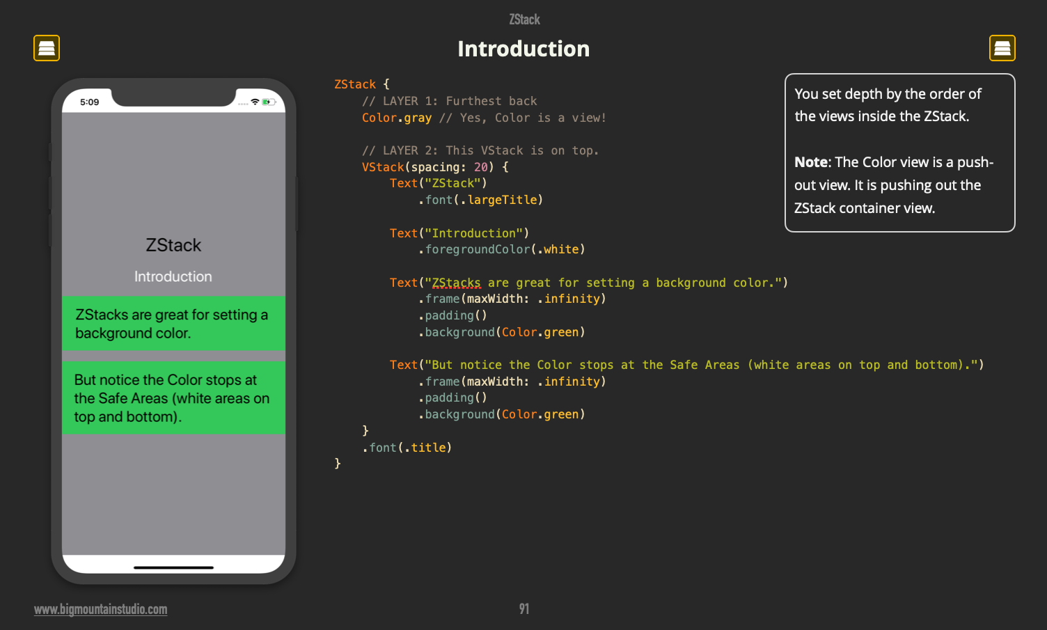 The ZStack allows you to put views one on top of the other in #SwiftUI. This is also the most common way to give your screens a background color. Want to learn how to expand the color into the safe areas (white areas on top/bottom) then check out this book: <your link>