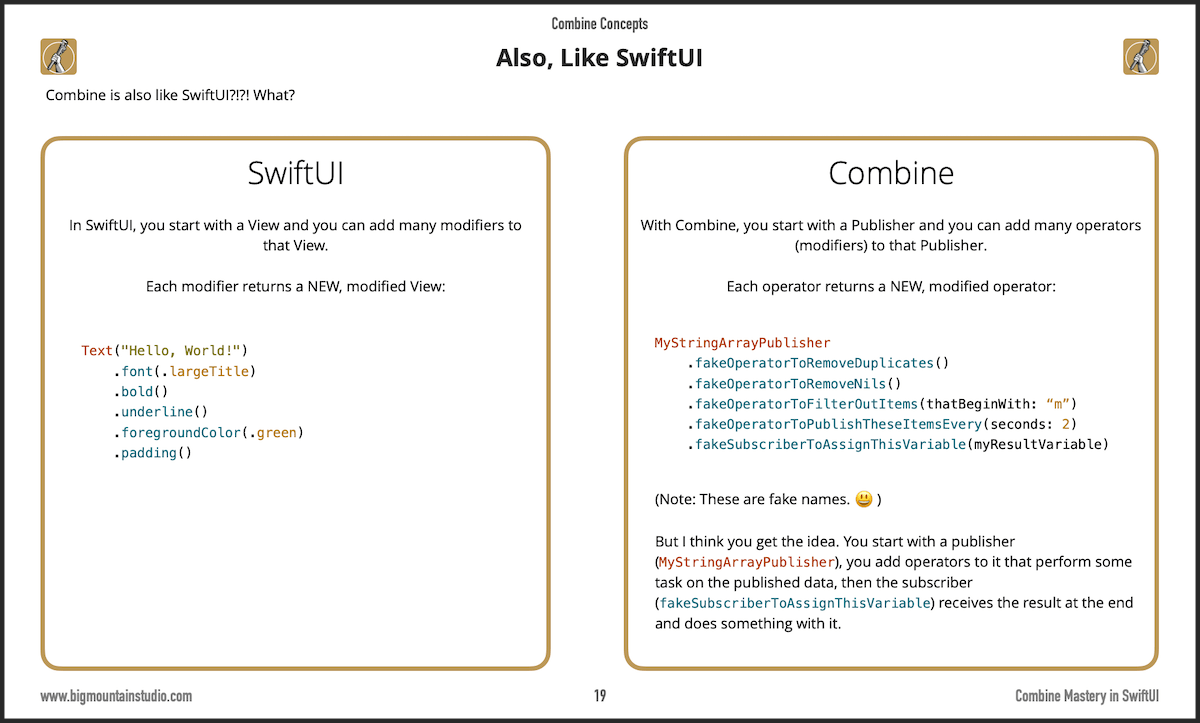 I know SwiftUI but never used Combine. Seeing this really made Combine click for me! Check out this cool book from @BigMtnStudio: <your link>
