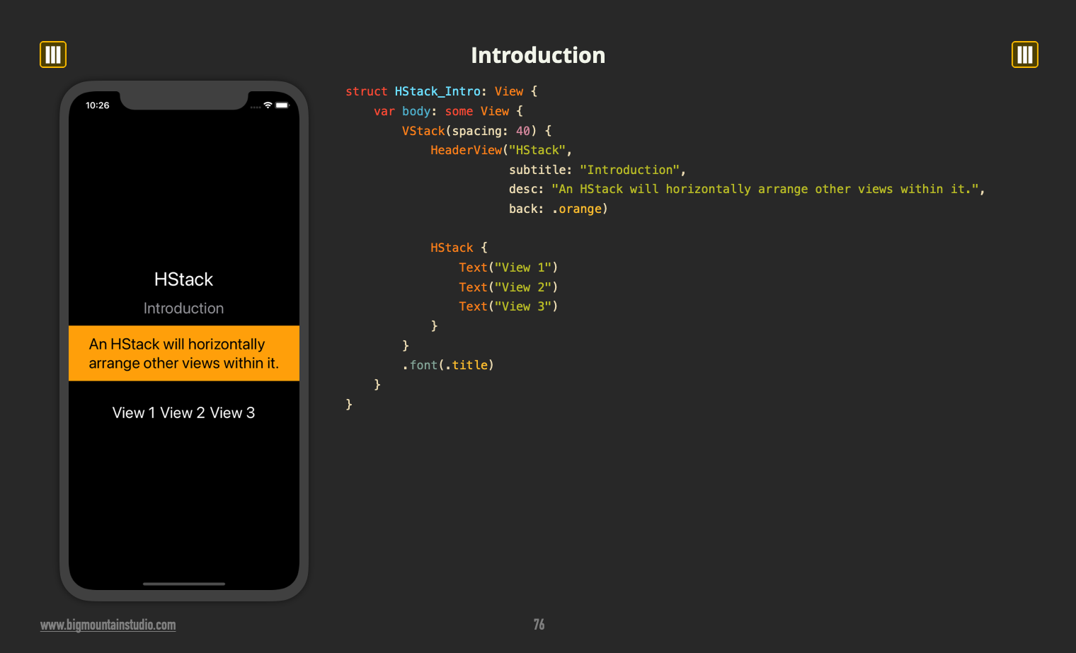 The HStack in #SwiftUI will layout views horizontally. It also allows you to adjust the alignment and spacing. To learn how, download the book at <your link>.