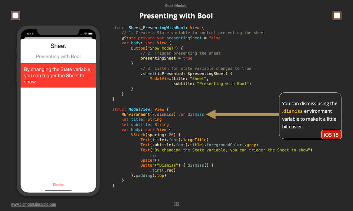 Programmatically dismiss a sheet by using dismiss environment property.