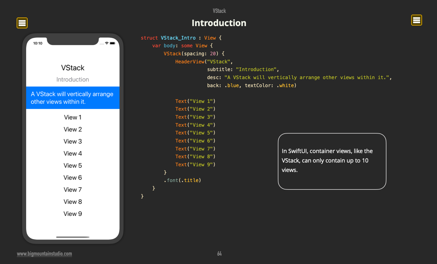The VStack in #SwiftUI helps you layout views vertically. Watch out though because you can only have up to 10 views. If you want to find out ways to get around this, check out this book. <your link>