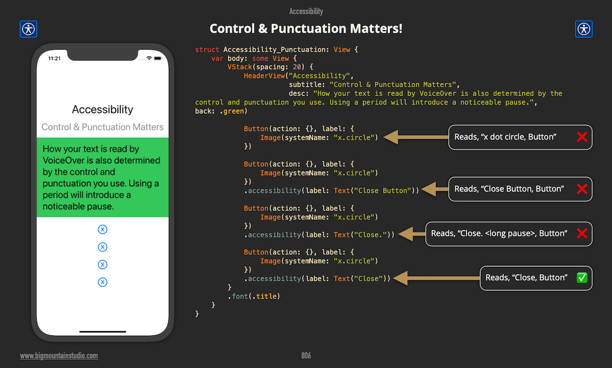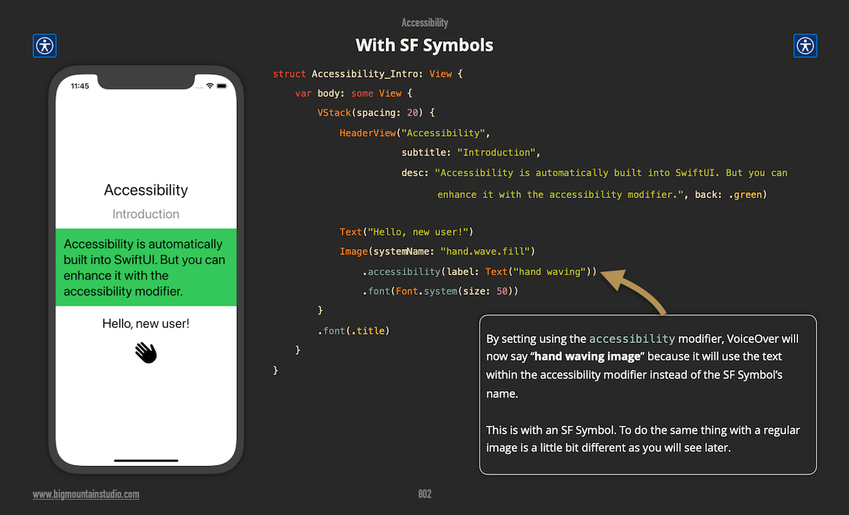 VoiceOver will literally read your SF Symbol name like, "hand dot wave dot fill". 💡 Make it better with the accessibility modifier and supply the text you want it to read instead.