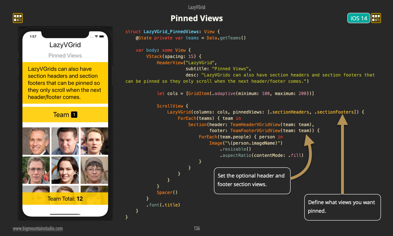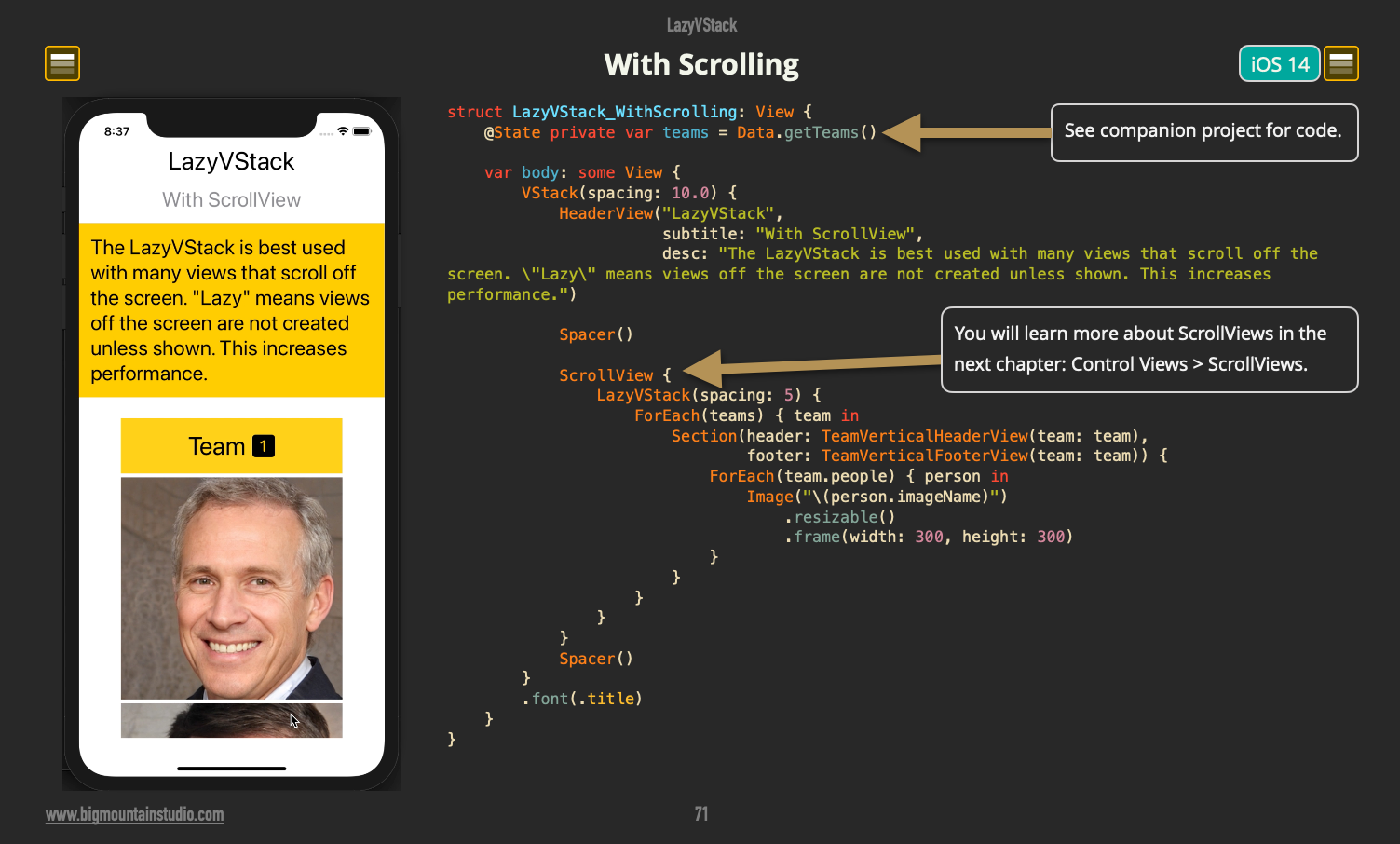 The LazyVStack in #SwiftUI will not render a view until it needs to. This increases memory efficiency. You can also "pin" headers and footers as well as use a LazyHStack. To learn how, check out this book today: <your link>
