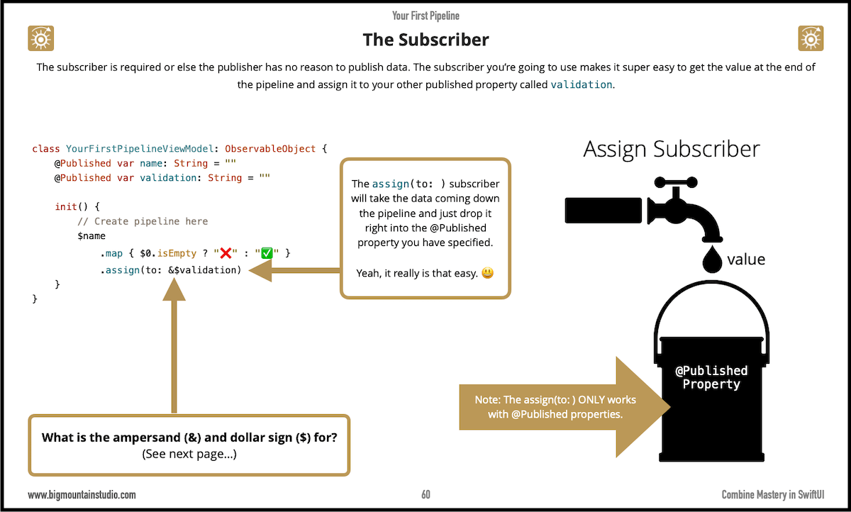 And now for your first #Combine subscriber. The assign(to:) subscriber will take any data coming down the pipeline and assign it to a Published property. Easy. And that's your first Combine pipeline right there. Get over a hundred more examples: <your link>