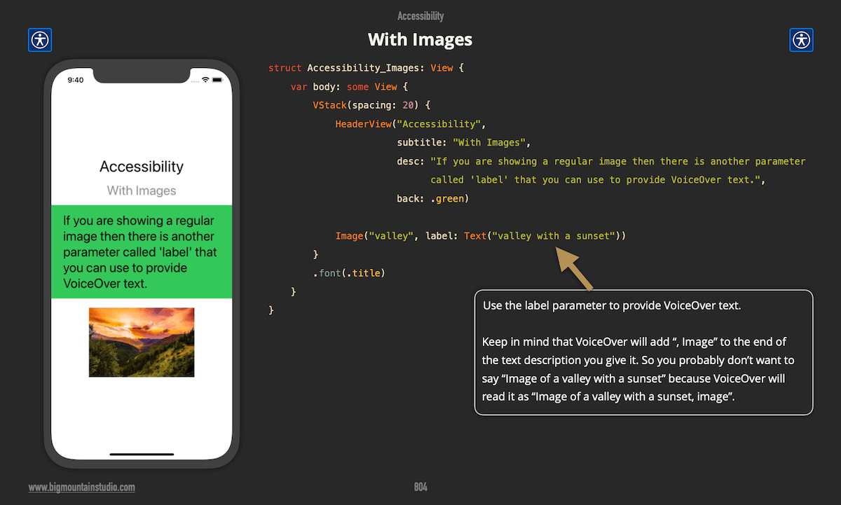 To provide voiceover for images, assign the label parameter with a Text value.