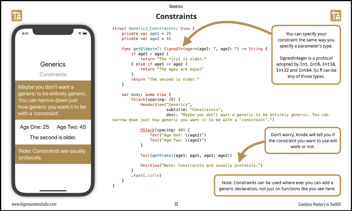 Sometimes you want to constrain or limit which types a generic should be. You can add constraints to generics just like you would any variable you declare. You will see specific #Combine examples at the end of the chapter. Get the free book: <your link>